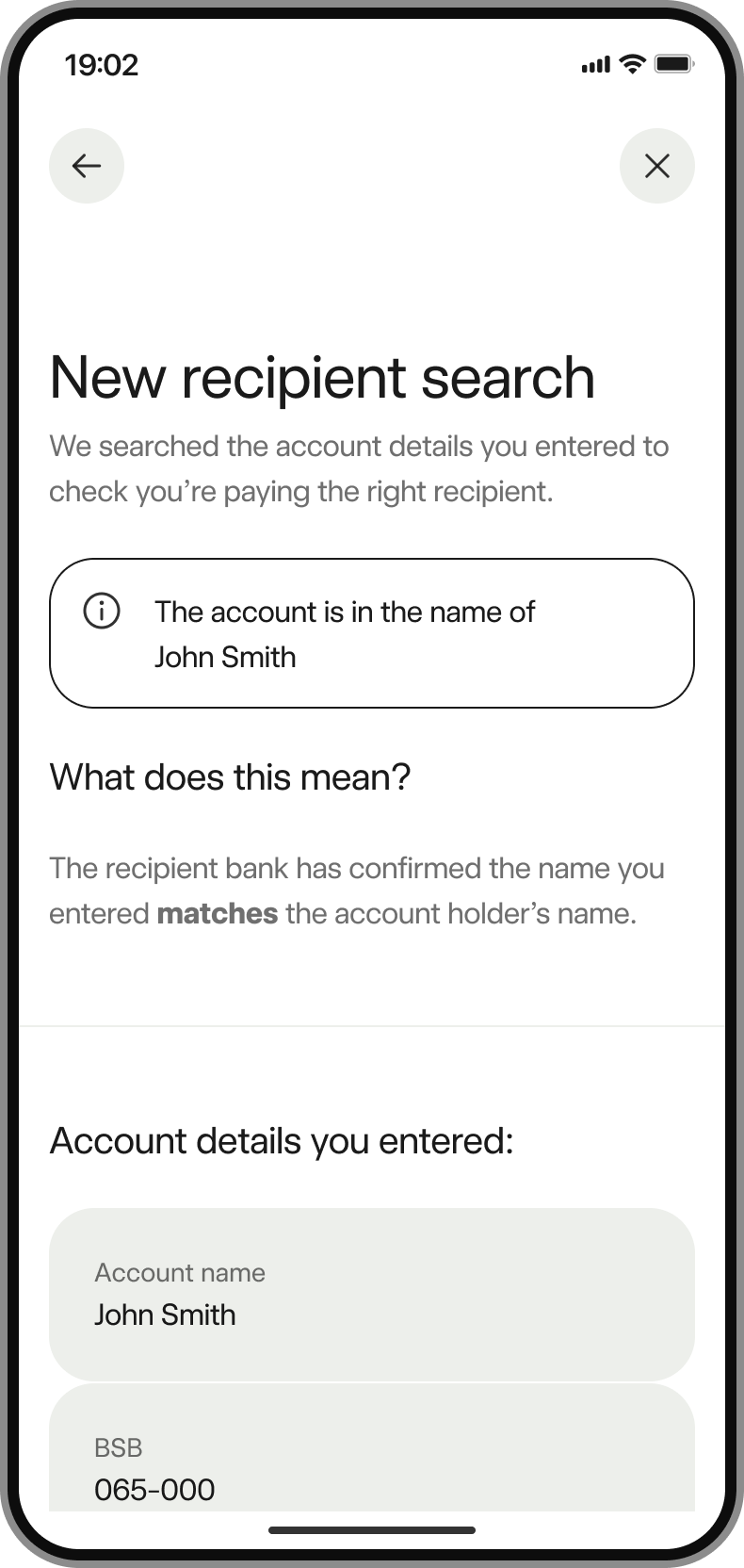 - Confirmation of Payee checks if the account name, BSB and account number you entered match details held by the receiving bank.