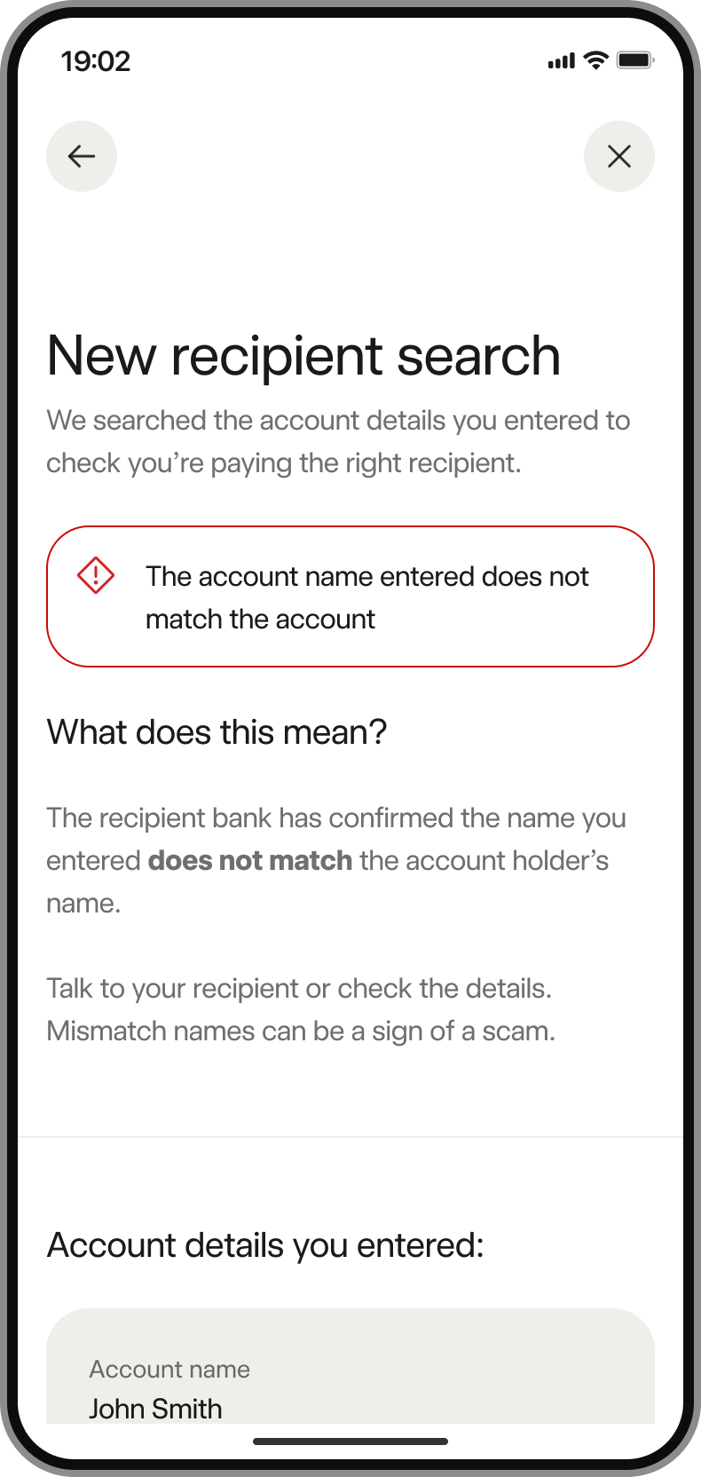 The Confirmation of Payee service could not confirm the account details you entered match. Check the details carefully.