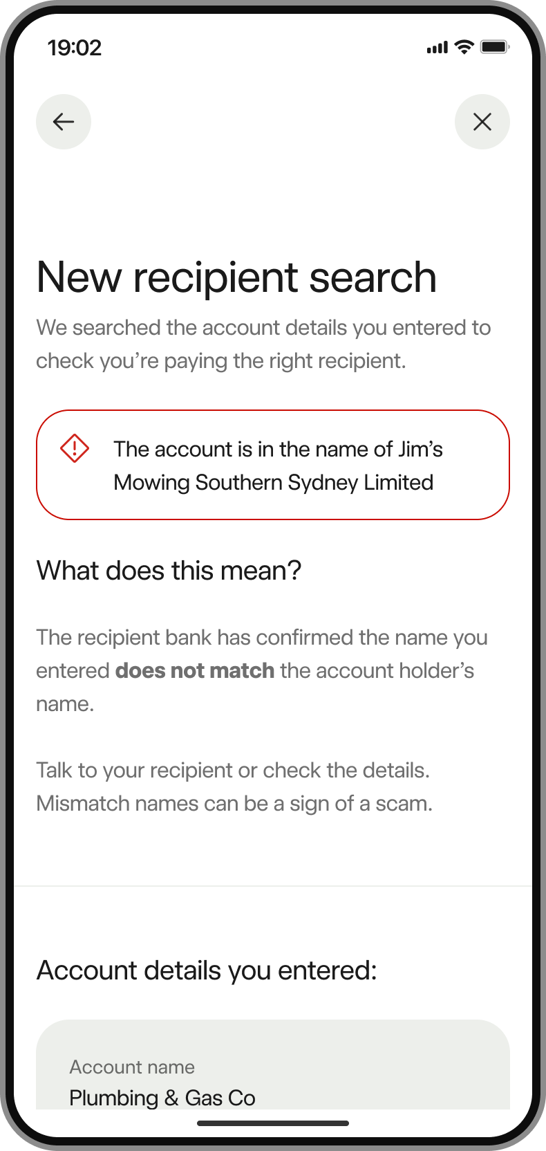 A name that doesn’t match an account can be a sign of a scam. You should speak to the payee to check it’s really them requesting the payment and confirm the BSB and account number. Or, there could be a typo – check the account name, BSB and account number you’ve entered are correct.