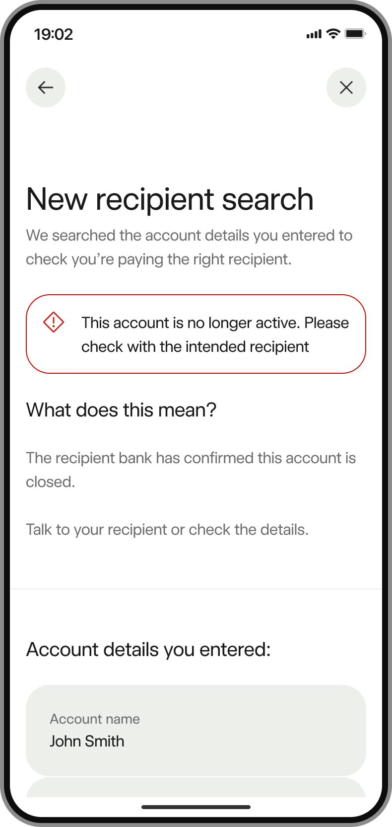 The account name doesn’t match the name at the receiving bank. If it’s a business, we’ll show the business or trading name. Check the details carefully, as mistaken payments may not be recoverable.